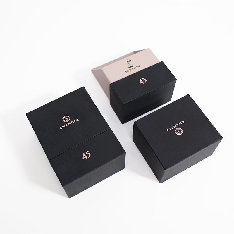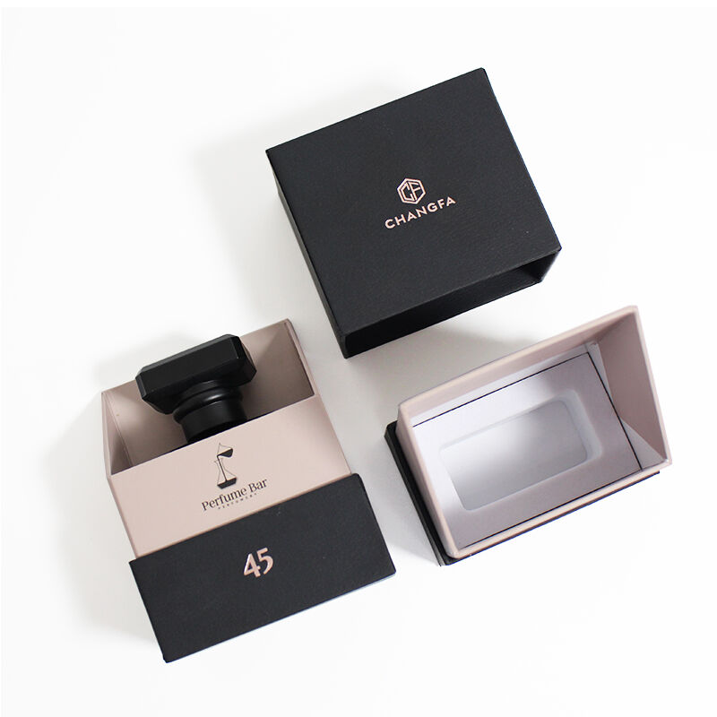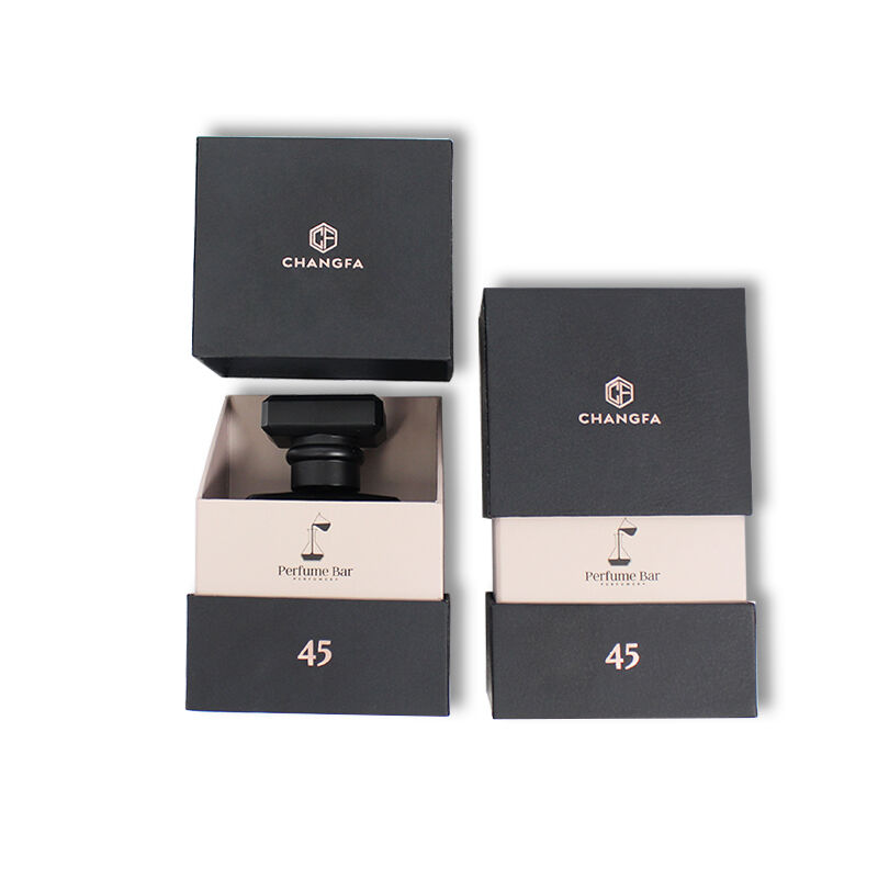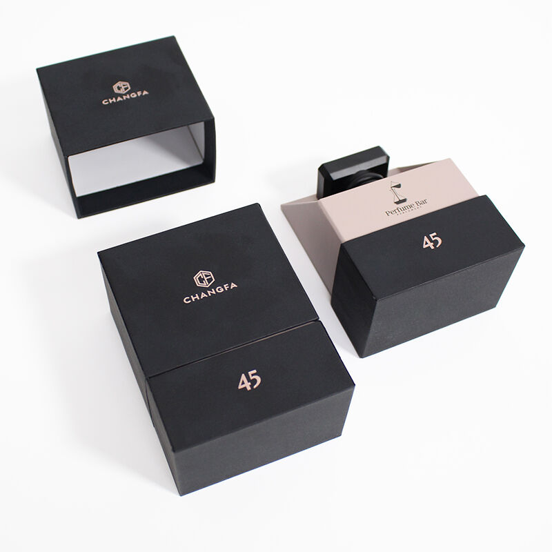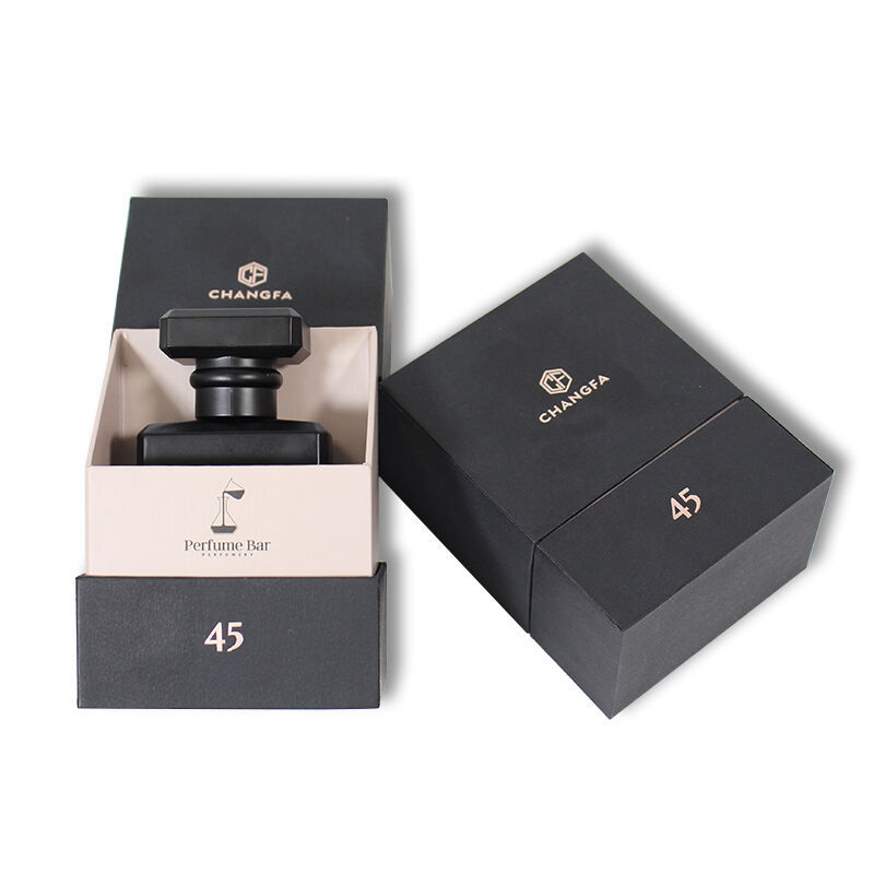 Scatola per profumi con coperchio rimovibile in carta testurizzata nera e inserto in EVA